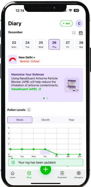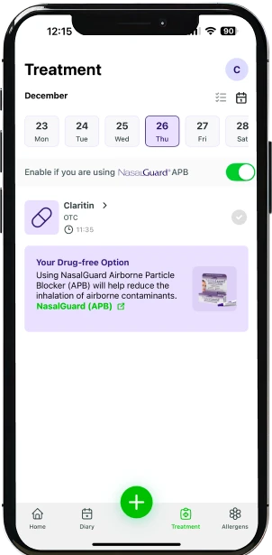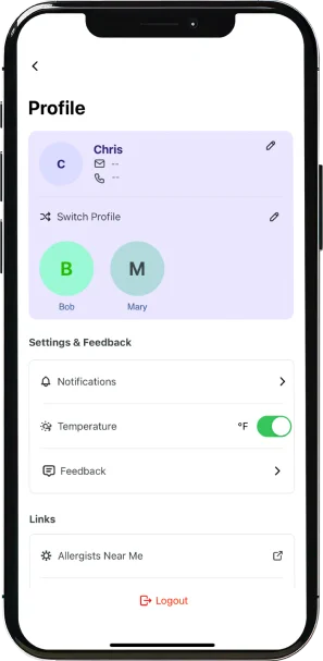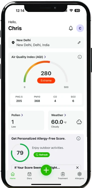Actualizando periódicamente tus síntomas y permitiendo que la app acceda a tu ubicación, vas a recibir un puntaje sin alergias que reflejará lo bien que estás controlando tu salud. Esta puntuación personalizada te permite tener el control, tomar decisiones proactivas y protegerte a vos mismo y a tus seres queridos de los factores ambientales desencadenantes.